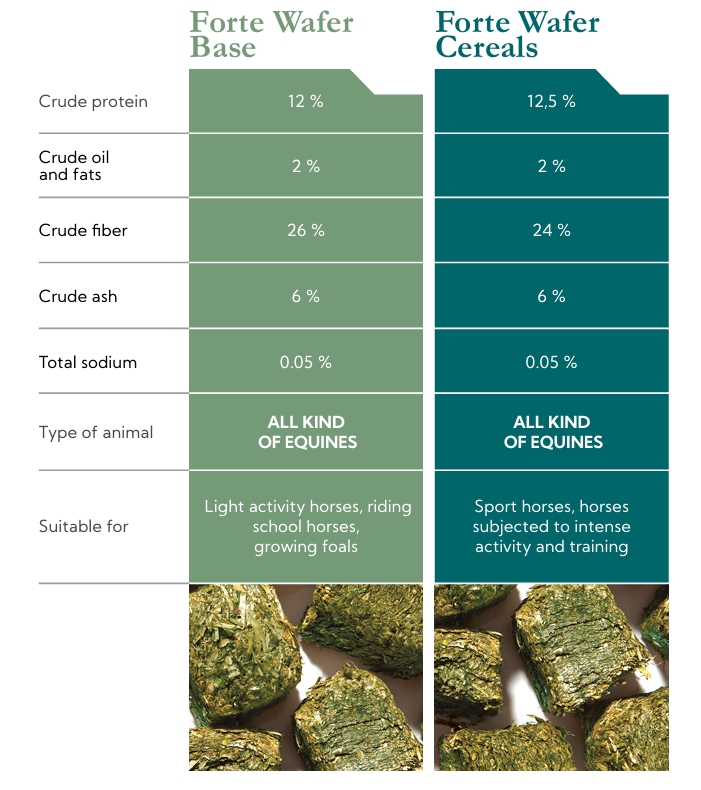 יש להאכיל את מוצר האספסת הקצוץ והמיובש "FORTE WAFER BASE" לסוסים פעילים ומתאמנים בקצב של 1 – 1.5 ק"ג לכל 100 ק"ג משקל גוף.
